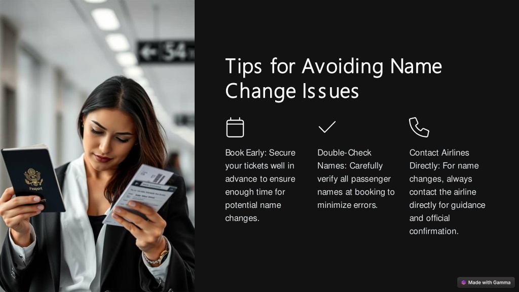 Tips for Avoiding Name Tips for Avoiding Name Change Issues Change Issues Book Early: Secure your tickets well in advance to ensure enough time for potential name changes. Double-Check Names: Carefully verify all passenger names at booking to minimize errors. Contact Airlines Directly: For name changes, always contact the airline directly for guidance and official confirmation.