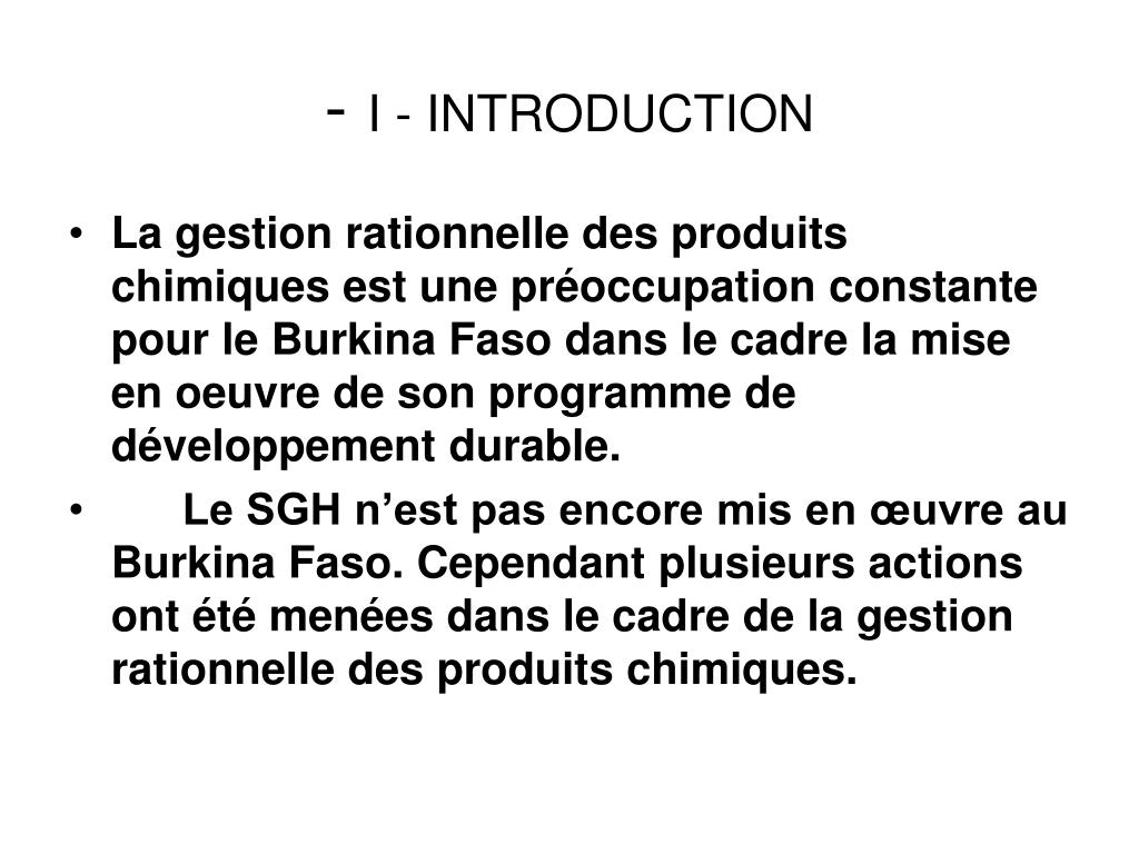- I - INTRODUCTION • La gestion rationnelle des produits chimiques est une préoccupation constante pour le Burkina Faso dans le cadre la mise en oeuvre de son programme de développement durable. • Le SGH n’est pas encore mis en œuvre au Burkina Faso. Cependant plusieurs actions ont été menées dans le cadre de la gestion rationnelle des produits chimiques.