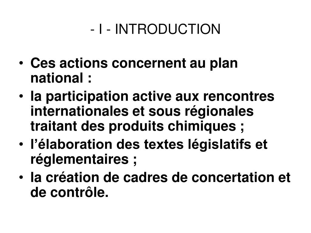 - I - INTRODUCTION • Ces actions concernent au plan national : • la participation active aux rencontres internationales et sous régionales traitant des produits chimiques ; • l’élaboration des textes législatifs et réglementaires ; • la création de cadres de concertation et de contrôle.