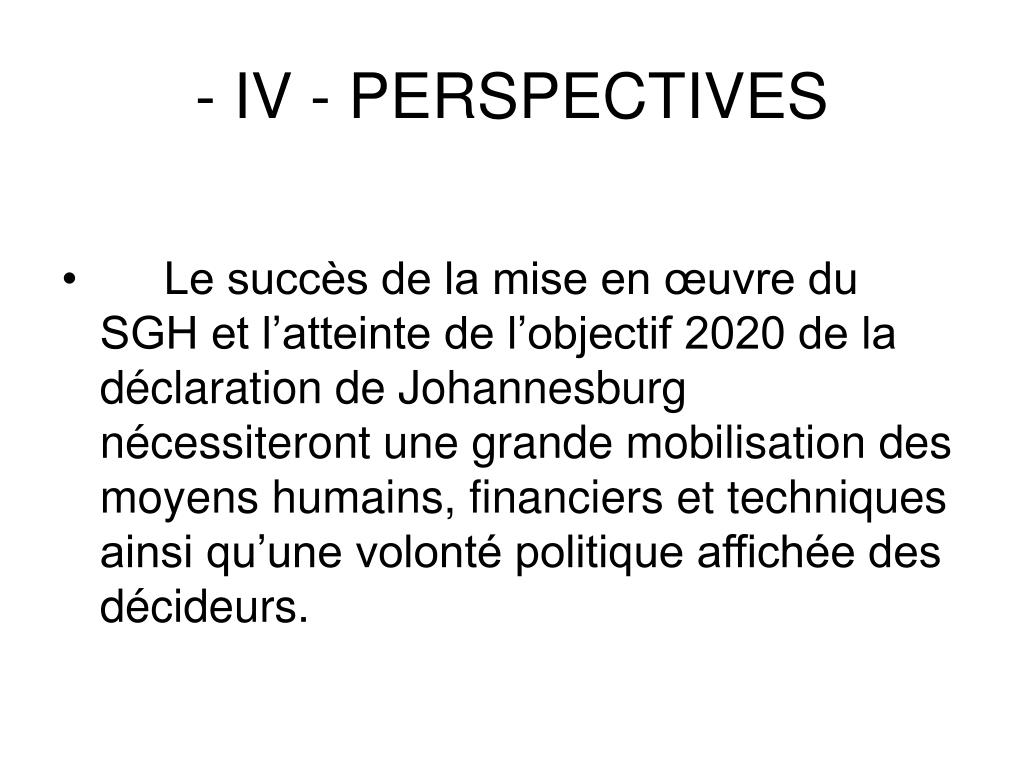 - IV - PERSPECTIVES • Le succès de la mise en œuvre du SGH et l’atteinte de l’objectif 2020 de la déclaration de Johannesburg nécessiteront une grande mobilisation des moyens humains, financiers et techniques ainsi qu’une volonté politique affichée des décideurs.