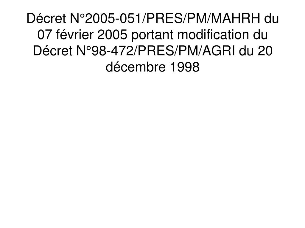 Décret N°2005-051/PRES/PM/MAHRH du 07 février 2005 portant modification du Décret N°98-472/PRES/PM/AGRI du 20 décembre 1998