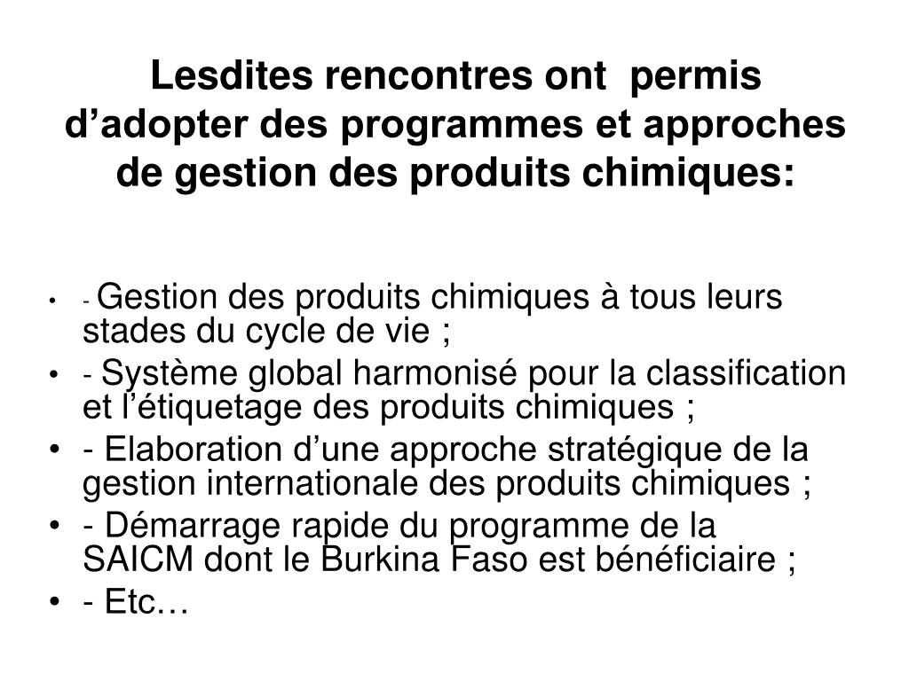 Lesdites rencontres ont permis d’adopter des programmes et approches de gestion des produits chimiques: • - Gestion des produits chimiques à tous leurs stades du cycle de vie ; • - Système global harmonisé pour la classification et l’étiquetage des produits chimiques ; • - Elaboration d’une approche stratégique de la gestion internationale des produits chimiques ; • - Démarrage rapide du programme de la SAICM dont le Burkina Faso est bénéficiaire ; • - Etc…
