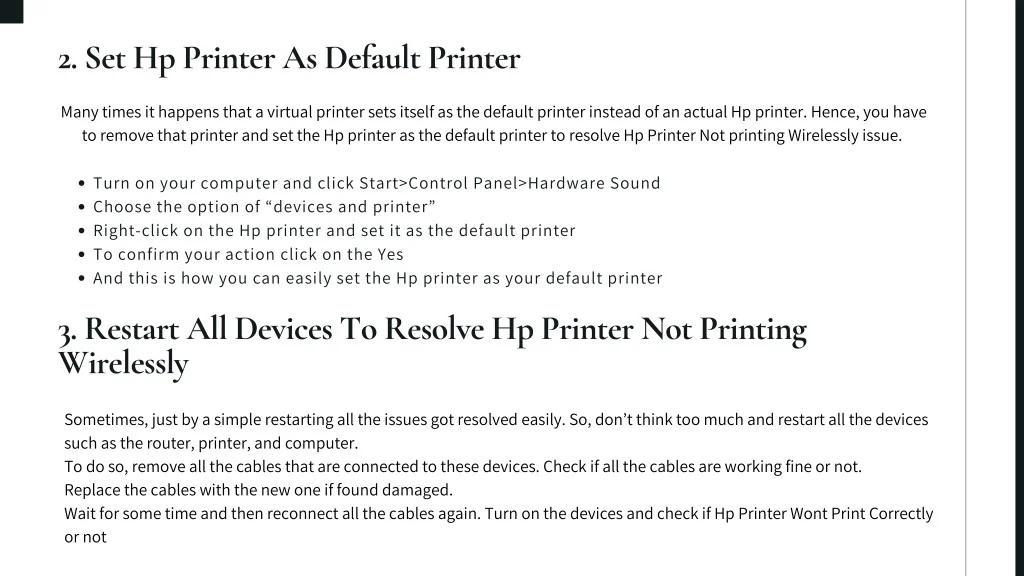2. Set Hp Printer As Default Printer Many times it happens that a virtual printer sets itself as the default printer instead of an actual Hp printer. Hence, you have to remove that printer and set the Hp printer as the default printer to resolve Hp Printer Not printing Wirelessly issue. Turn on your computer and click Start>Control Panel>Hardware Sound Choose the option of “devices and printer” Right-click on the Hp printer and set it as the default printer To confirm your action click on the Yes And this is how you can easily set the Hp printer as your default printer 3. Restart All Devices To Resolve Hp Printer Not Printing Wirelessly Sometimes, just by a simple restarting all the issues got resolved easily. So, don’t think too much and restart all the devices such as the router, printer, and computer. To do so, remove all the cables that are connected to these devices. Check if all the cables are working fine or not. Replace the cables with the new one if found damaged. Wait for some time and then reconnect all the cables again. Turn on the devices and check if Hp Printer Wont Print Correctly or not