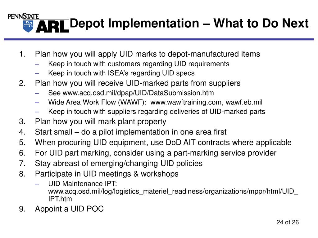 Depot Implementation – What to Do Next • Plan how you will apply UID marks to depot-manufactured items • Keep in touch with customers regarding UID requirements • Keep in touch with ISEA’s regarding UID specs • Plan how you will receive UID-marked parts from suppliers • See www.acq.osd.mil/dpap/UID/DataSubmission.htm • Wide Area Work Flow (WAWF): www.wawftraining.com, wawf.eb.mil • Keep in touch with suppliers regarding deliveries of UID-marked parts • Plan how you will mark plant property • Start small – do a pilot implementation in one area first • When procuring UID equipment, use DoD AIT contracts where applicable • For UID part marking, consider using a part-marking service provider • Stay abreast of emerging/changing UID policies • Participate in UID meetings & workshops • UID Maintenance IPT: www.acq.osd.mil/log/logistics_materiel_readiness/organizations/mppr/html/UID_IPT.htm • Appoint a UID POC