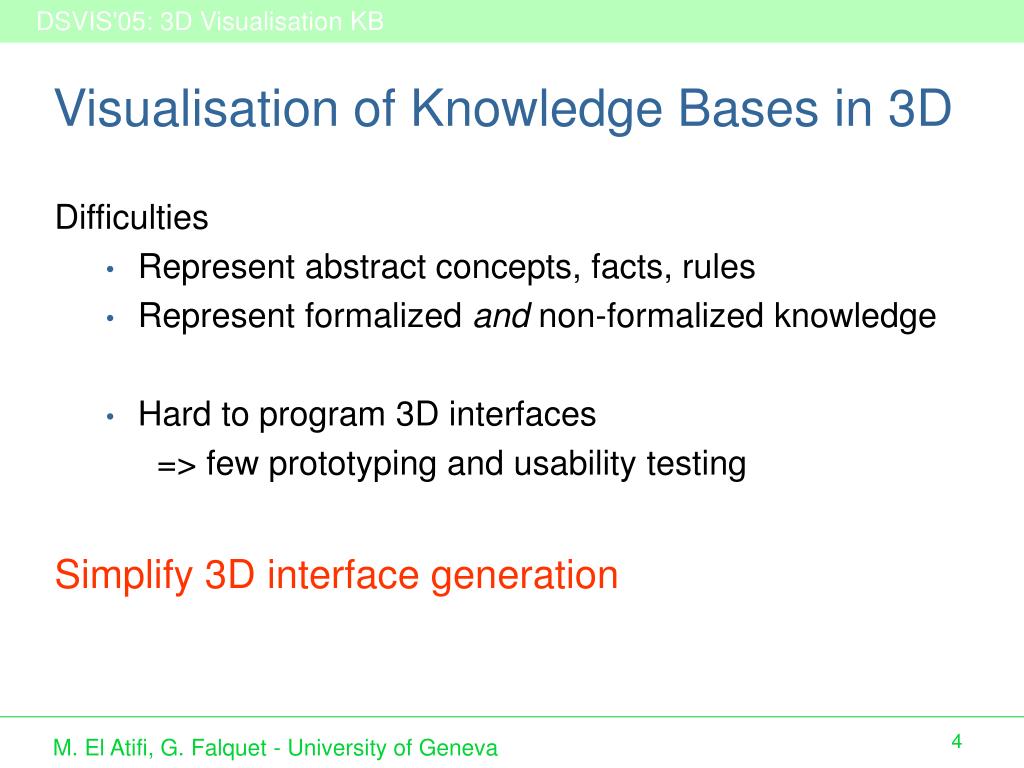 A Specification Language and System for the Three-Dimensional Visualisation of Knowledge Bases. El Mustapha EL ATIFI and Gilles FALQUET. Information System Interfaces Department of Information Systems University of Geneva. Context. Study the 3D visualisation of knowledge bases