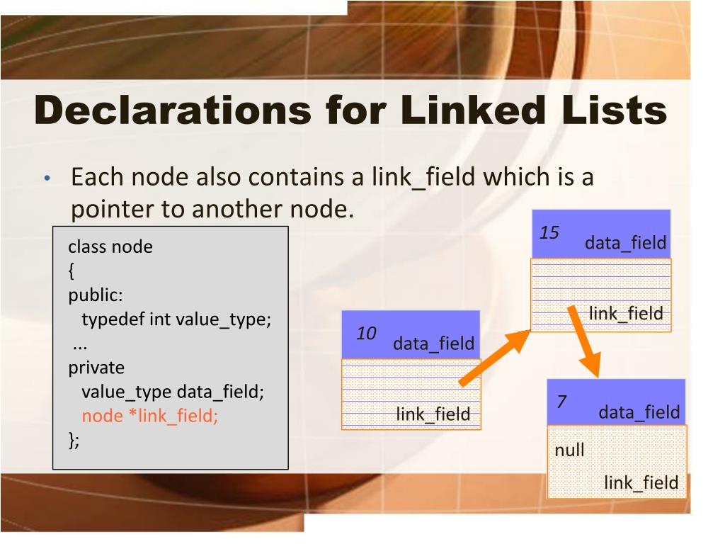 Declarations for Linked Lists • For this presentation, nodes in a linked list are objects, as shown here. 15 data_field class node { public: typedef double value_type; ... private value_typedata_field; node *link_field; }; link_field 10 data_field 7 data_field link_field null link_field