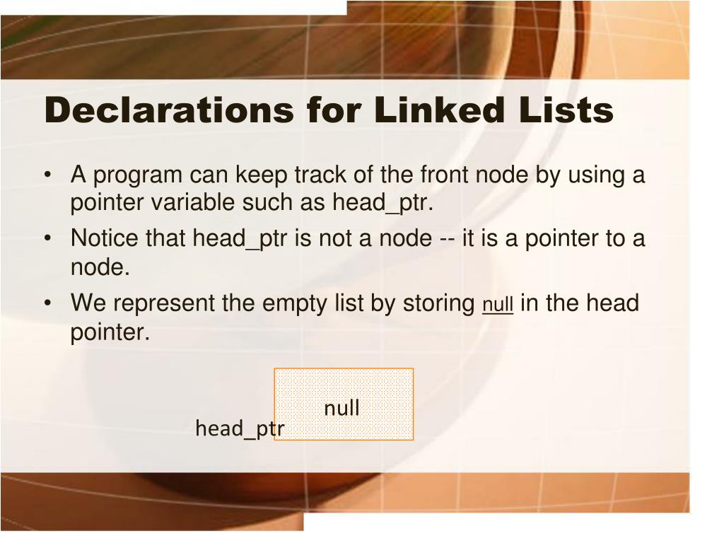 Declarations for Linked Lists • A program can keep track of the front node by using a pointer variable such as head_ptr. • Notice that head_ptr is not a node -- it is a pointer to a node. • We represent the empty list by storing nullin the head pointer. null head_ptr