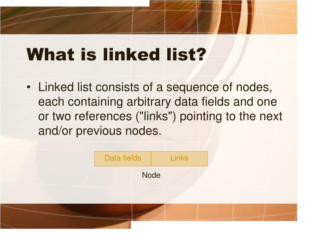 What is linked list? • Linked list consists of a sequence of nodes, each containing arbitrary data fields and one or two references ("links") pointing to the next and/or previous nodes. Data fields Links Node