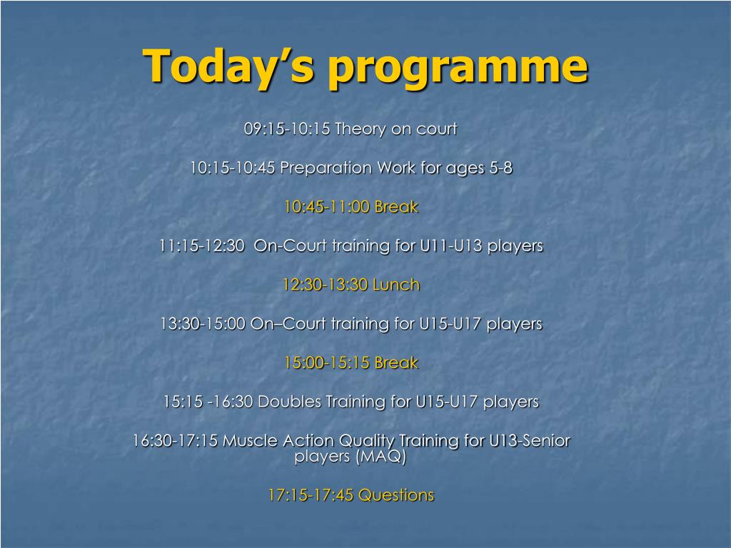 Today’s programme. 09:15-10:15 Theory on court 10:15-10:45 Preparation Work for ages 5-8 10:45-11:00 Break 11:15-12:30 On-Court training for U11-U13 players 12:30-13:30 Lunch 13:30-15:00 On–Court training for U15-U17 players 15:00-15:15 Break