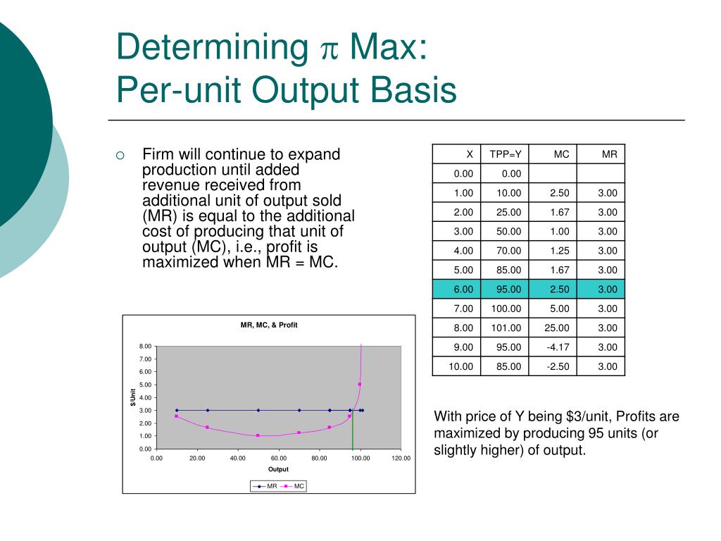 Determining Max:Per-unit Output Basis • Firm will continue to expand production until added revenue received from additional unit of output sold (MR) is equal to the additional cost of producing that unit of output (MC), i.e., profit is maximized when MR = MC. With price of Y being $3/unit, Profits are maximized by producing 95 units (or slightly higher) of output.