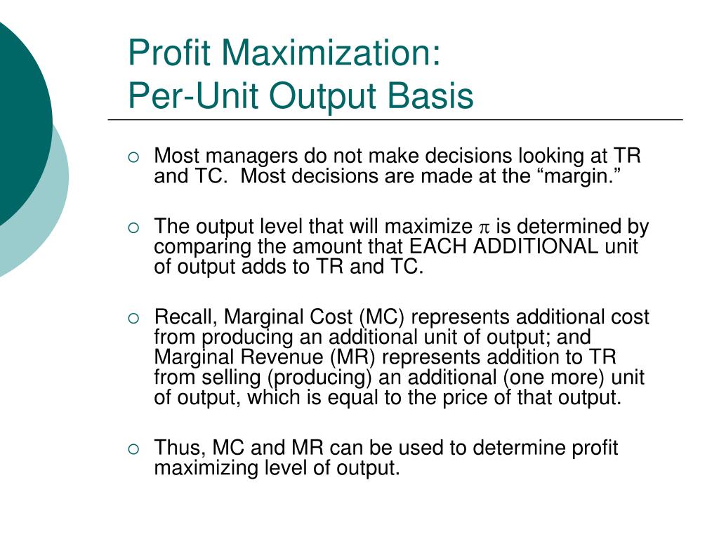 Profit Maximization:Per-Unit Output Basis • Most managers do not make decisions looking at TR and TC. Most decisions are made at the “margin.” • The output level that will maximize is determined by comparing the amount that EACH ADDITIONAL unit of output adds to TR and TC. • Recall, Marginal Cost (MC) represents additional cost from producing an additional unit of output; and Marginal Revenue (MR) represents addition to TR from selling (producing) an additional (one more) unit of output, which is equal to the price of that output. • Thus, MC and MR can be used to determine profit maximizing level of output.
