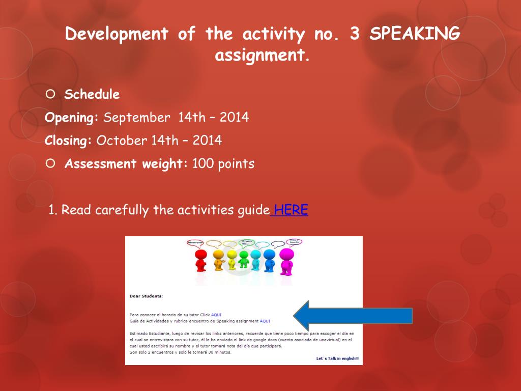 Development of the activity no. 3 SPEAKING assignment. • Schedule Opening:September 14th – 2014 Closing:October 14th – 2014 • Assessment weight:100 points 1. Read carefully the activities guideHERE