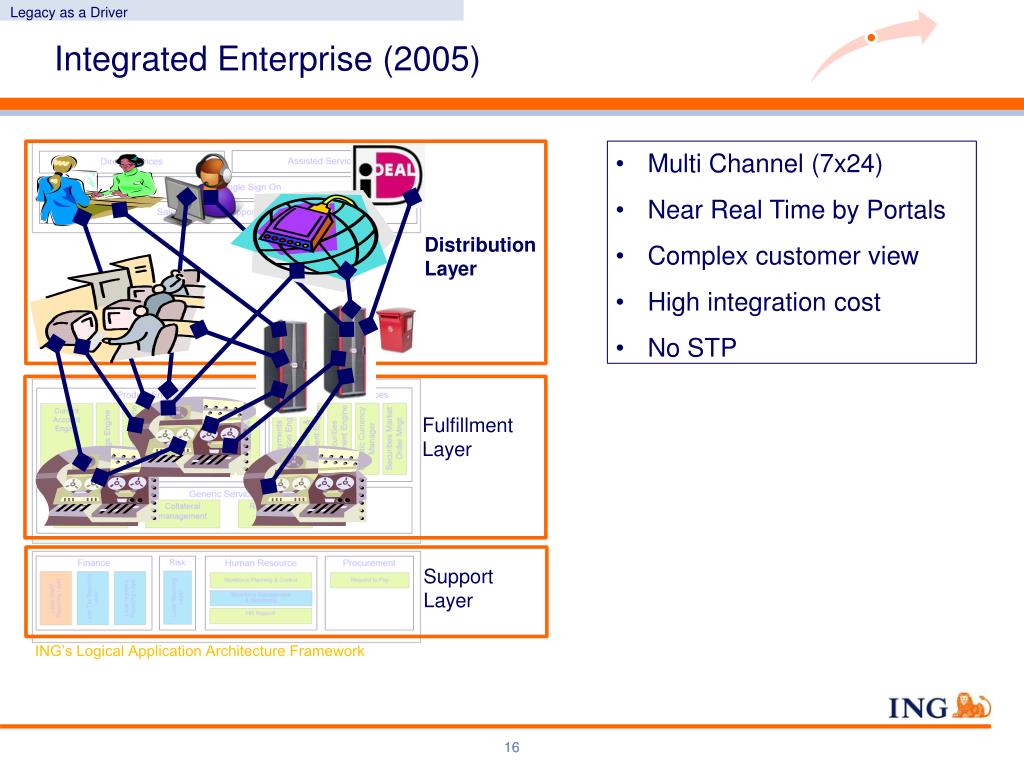 Legacy as a Driver Connected Enterprise (1986) • Introduction of Girotel, payments; Direct Channel to the back office Systems • Back Office became visible to customers (or not) • Drivers: Speed & Convenience Distribution Layer FulfillmentLayer SupportLayer ING’s Logical Application Architecture Framework 15