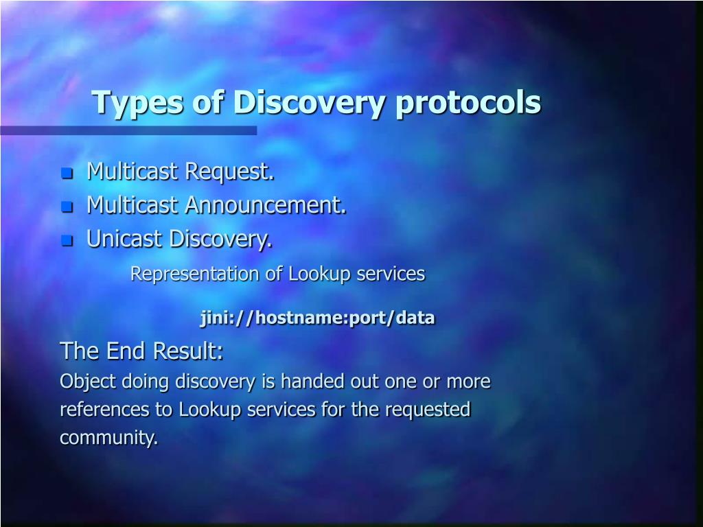 Types of Discovery protocols • Multicast Request. • Multicast Announcement. • Unicast Discovery. Representation of Lookup services jini://hostname:port/data The End Result: Object doing discovery is handed out one or more references to Lookup services for the requested community.