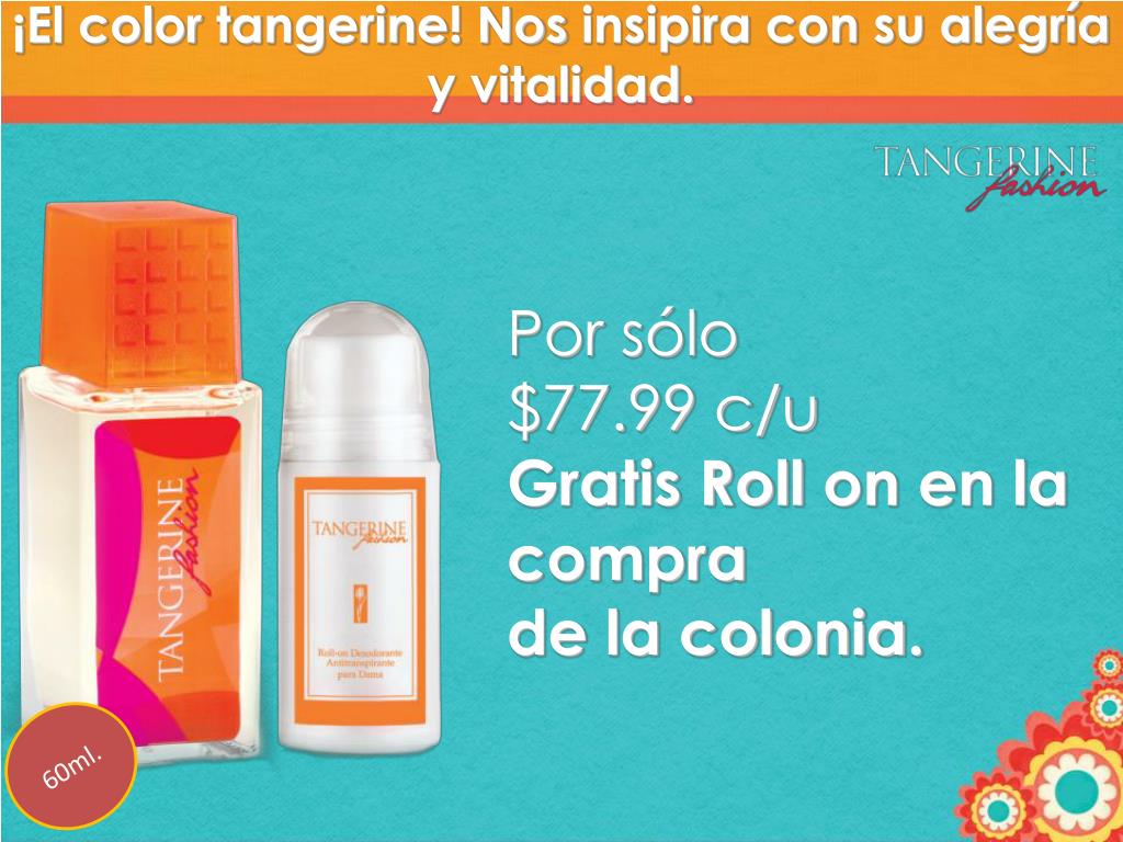 ¡El color tangerine! Nos insipira con su alegría y vitalidad. Por sólo $77.99 c/u Gratis Roll on en la compra de la colonia. 60ml.