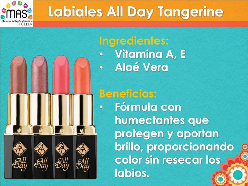 Labiales All Day Tangerine • Ingredientes: • Vitamina A, E • Aloé Vera • Beneficios: • Fórmula con humectantes que protegen y aportan brillo, proporcionando color sin resecar los labios.