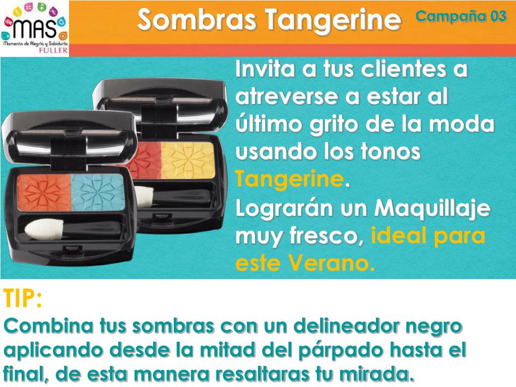 Sombras Tangerine Campaña 03 Invita a tus clientes a atreverse a estar al último grito de la moda usando los tonos Tangerine. Lograrán un Maquillaje muy fresco, ideal para este Verano. TIP: Combina tus sombras con un delineador negro aplicando desde la mitad del párpado hasta el final, de esta manera resaltaras tu mirada.