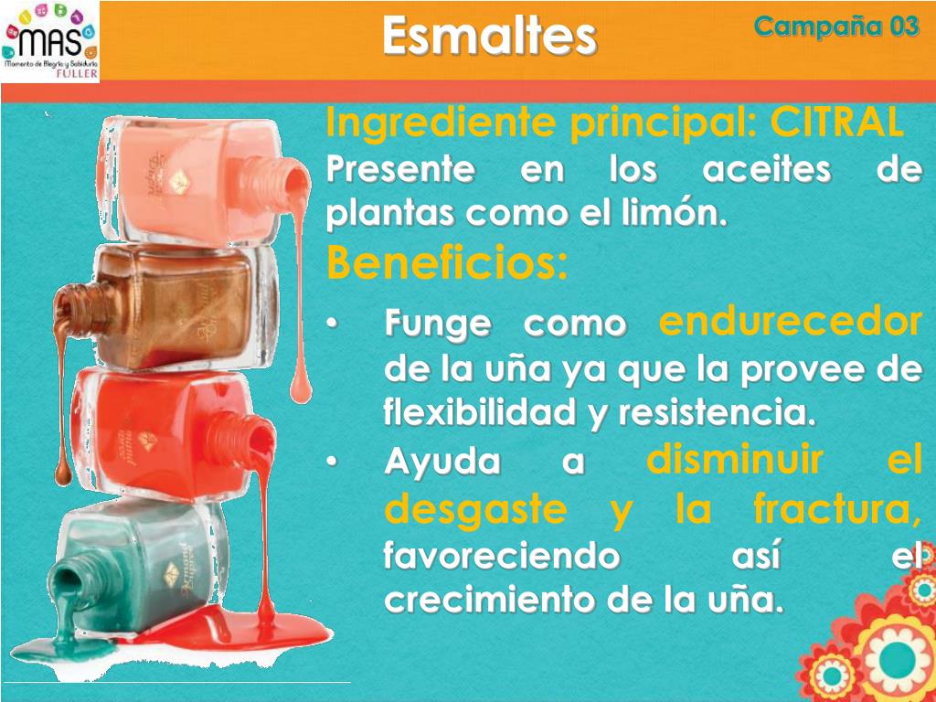 Esmaltes Campaña 03 • Ingrediente principal: CITRAL • Presente en los aceites de plantas como el limón. • Beneficios: • Funge como endurecedorde la uña ya que la provee de flexibilidad y resistencia. • Ayuda a disminuir el desgaste y la fractura, favoreciendo así el crecimiento de la uña.