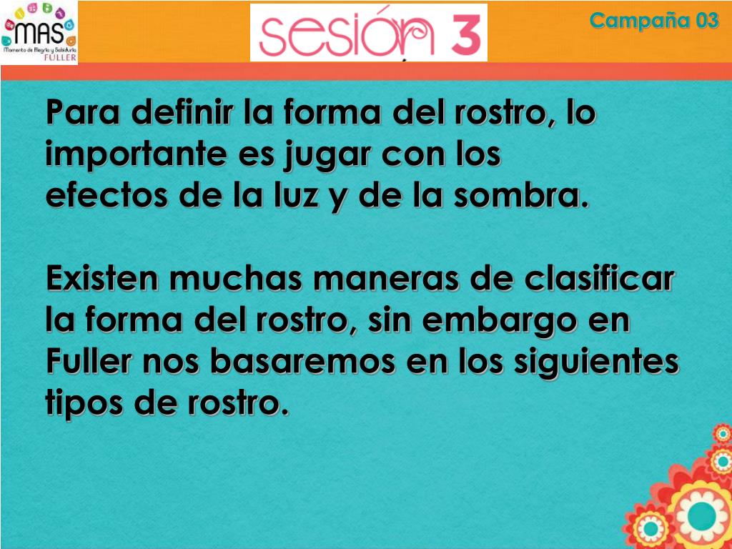 Campaña 03 Para definir la forma del rostro, lo importante es jugar con los efectos de la luz y de la sombra. Existen muchas maneras de clasificar la forma del rostro, sin embargo en Fuller nos basaremos en los siguientes tipos de rostro.