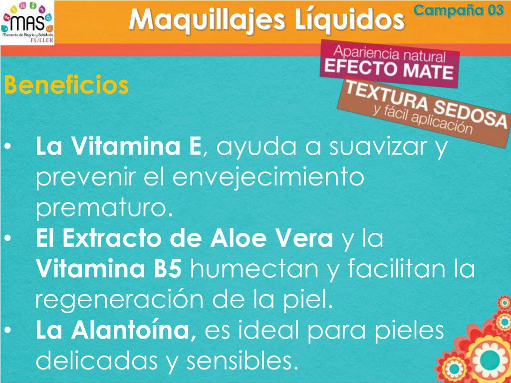 Maquillajes Líquidos Campaña 03 • Beneficios • La Vitamina E, ayuda a suavizar y prevenir el envejecimiento prematuro. • El Extracto de Aloe Vera y la Vitamina B5 humectan y facilitan la regeneración de la piel. • La Alantoína, es ideal para pieles delicadas y sensibles.
