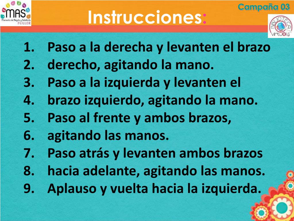 Campaña 03 Instrucciones: Paso a la derecha y levanten el brazo derecho, agitando la mano. Paso a la izquierda y levanten el brazo izquierdo, agitando la mano. Paso al frente y ambos brazos, agitando las manos. Paso atrás y levanten ambos brazos hacia adelante, agitando las manos. Aplauso y vuelta hacia la izquierda.
