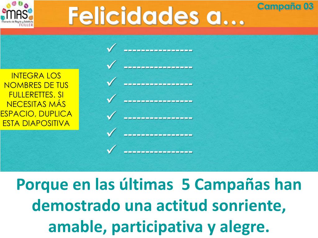 Felicidades a… Campaña 03 • ---------------- • ---------------- • ---------------- • ---------------- • ---------------- • ---------------- • ---------------- INTEGRA LOS NOMBRES DE TUS FULLERETTES. SI NECESITAS MÁS ESPACIO, DUPLICA ESTA DIAPOSITIVA Porque en las últimas 5 Campañas han demostrado una actitud sonriente, amable, participativa y alegre.