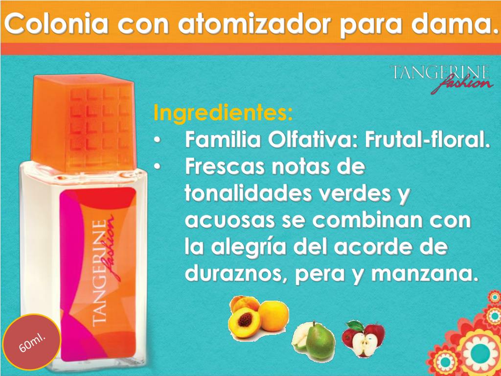 Colonia con atomizador para dama. • Ingredientes: • Familia Olfativa: Frutal-floral. • Frescas notas de tonalidades verdes y acuosas se combinan con la alegría del acorde de duraznos, pera y manzana. 60ml.
