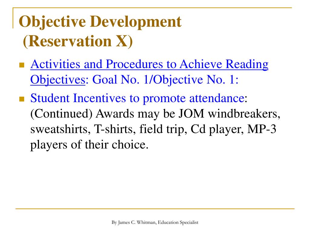 Objective Development (Reservation X) • Activities and Procedures to Achieve Reading Objectives:Goal No. 1/Objective No. 1: • Student Incentives to promote attendance: (Continued) Awards may be JOM windbreakers, sweatshirts, T-shirts, field trip, Cd player, MP-3 players of their choice. By James C. Whitman, Education Specialist
