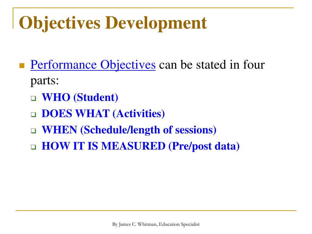 Objectives Development • Performance Objectives can be stated in four parts: • WHO (Student) • DOES WHAT (Activities) • WHEN (Schedule/length of sessions) • HOW IT IS MEASURED (Pre/post data) By James C. Whitman, Education Specialist