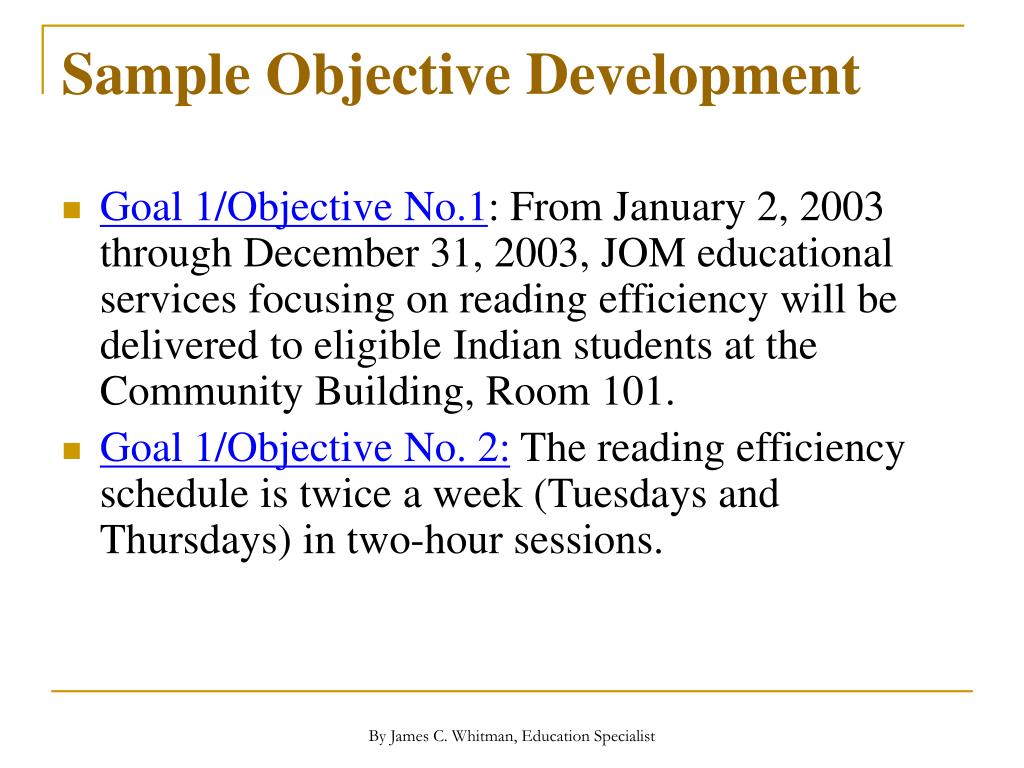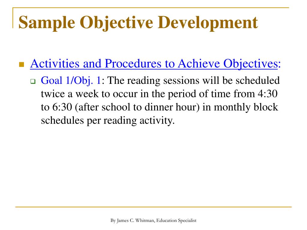 Sample Objective Development • Activities and Procedures to Achieve Objectives: • Goal 1/Obj. 1: The reading sessions will be scheduled twice a week to occur in the period of time from 4:30 to 6:30 (after school to dinner hour) in monthly block schedules per reading activity. By James C. Whitman, Education Specialist