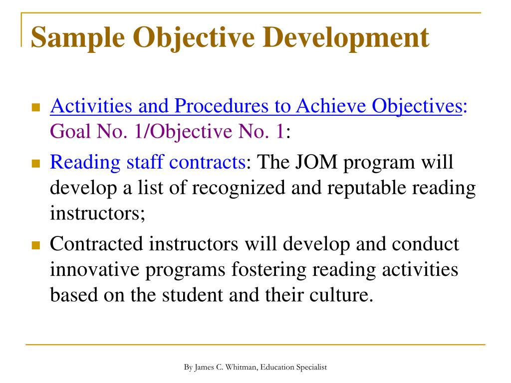 Sample Objective Development • Activities and Procedures to Achieve Objectives:Goal No. 1/Objective No. 1: • Reading staff contracts: The JOM program will develop a list of recognized and reputable reading instructors; • Contracted instructors will develop and conduct innovative programs fostering reading activities based on the student and their culture. By James C. Whitman, Education Specialist