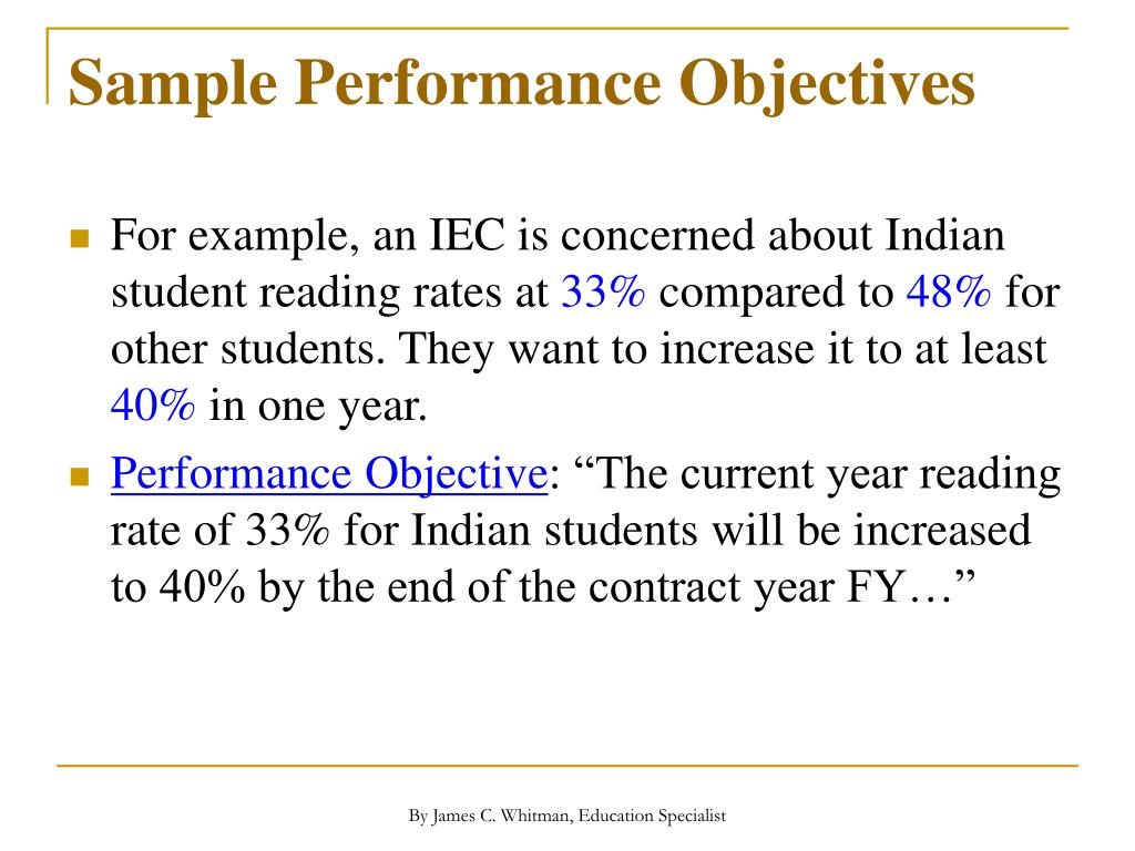 Sample Performance Objectives • For example, an IEC is concerned about Indian student reading rates at 33% compared to 48% for other students. They want to increase it to at least 40% in one year. • Performance Objective: “The current year reading rate of 33% for Indian students will be increased to 40% by the end of the contract year FY…” By James C. Whitman, Education Specialist