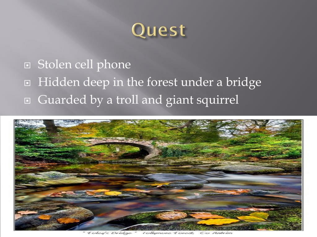 Quest • Stolen cell phone • Hidden deep in the forest under a bridge • Guarded by a troll and giant squirrel
