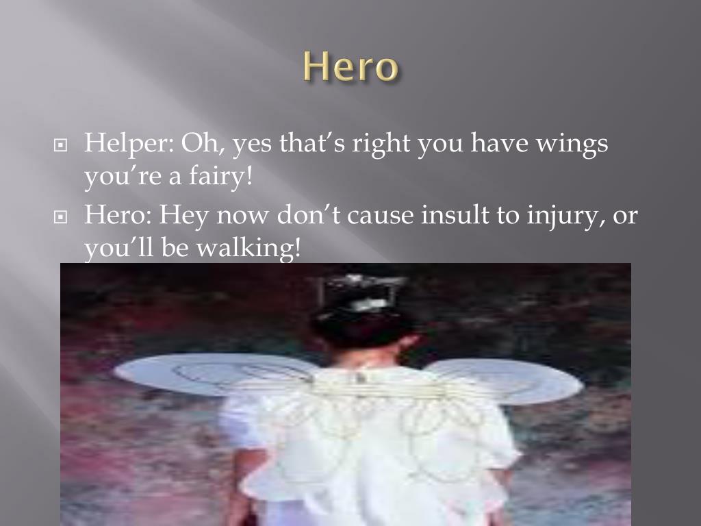 Hero • Helper: Oh, yes that’s right you have wings you’re a fairy! • Hero: Hey now don’t cause insult to injury, or you’ll be walking!