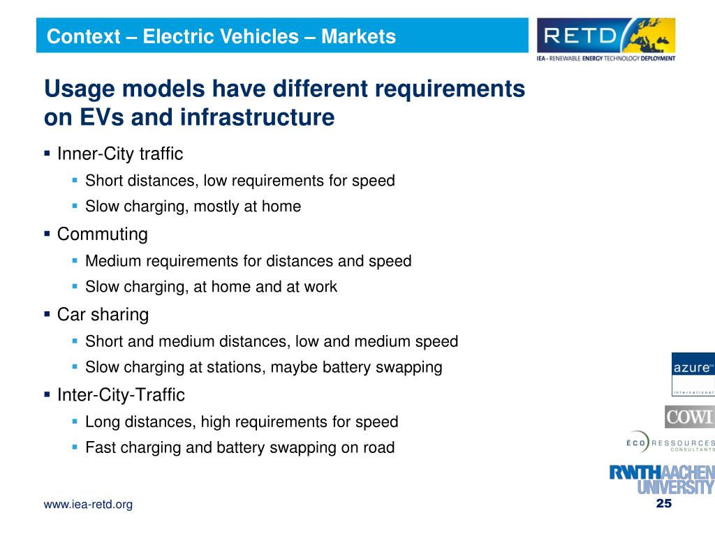 Context – Electric Vehicles – Markets Usage models have different requirements on EVs and infrastructure • Inner-City traffic • Short distances, low requirements for speed • Slow charging, mostly at home • Commuting • Medium requirements for distances and speed • Slow charging, at home and at work • Car sharing • Short and medium distances, low and medium speed • Slow charging at stations, maybe battery swapping • Inter-City-Traffic • Long distances, high requirements for speed • Fast charging and battery swapping on road