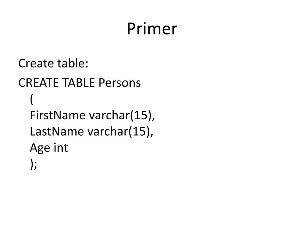 Primer kreiranja tabele z primarnim ključem CREATE TABLE Persons (personIDint NOT NULL AUTO_INCREMENT, PRIMARY KEY(personID),FirstNamevarchar(15),LastNamevarchar(15),Age int)";