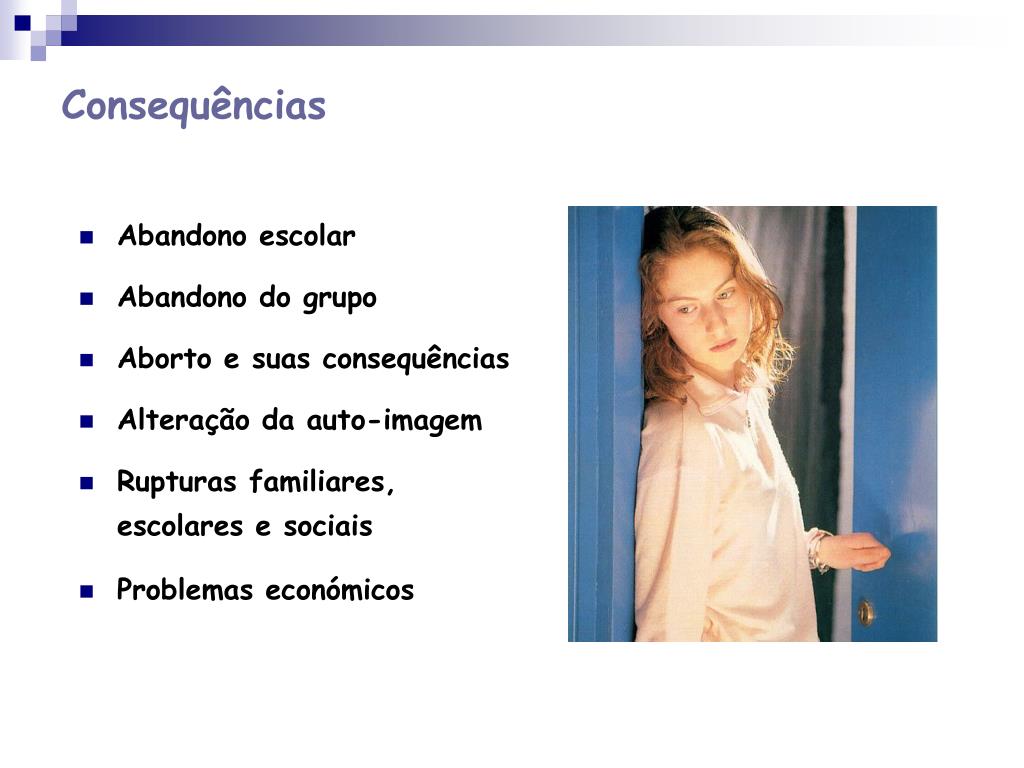 Consequências • Abandono escolar • Abandono do grupo • Aborto e suas consequências • Alteração da auto-imagem • Rupturas familiares, escolares e sociais • Problemas económicos
