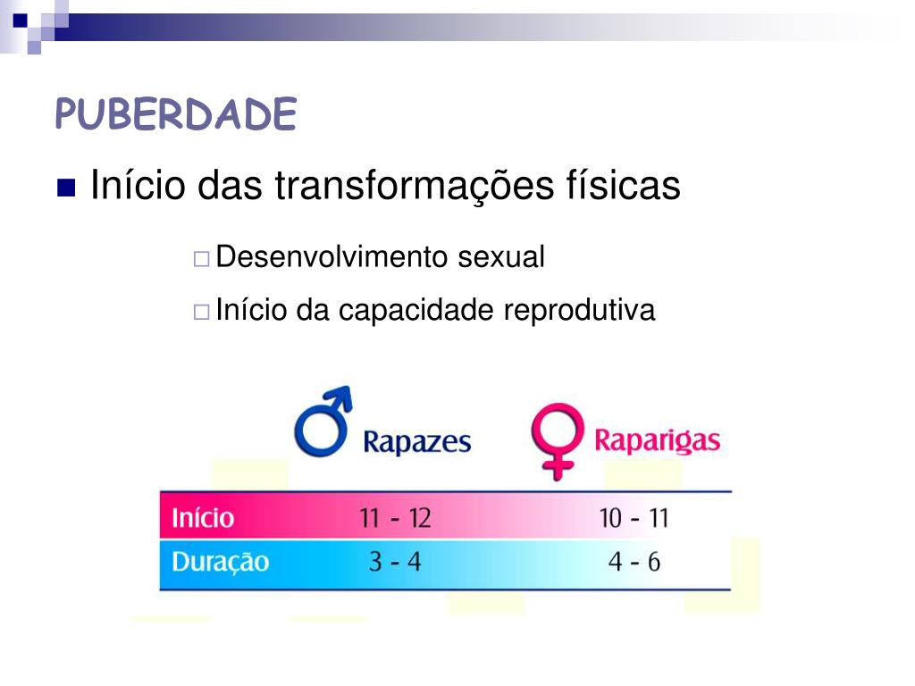 PUBERDADE • Início das transformações físicas • Desenvolvimento sexual • Início da capacidade reprodutiva