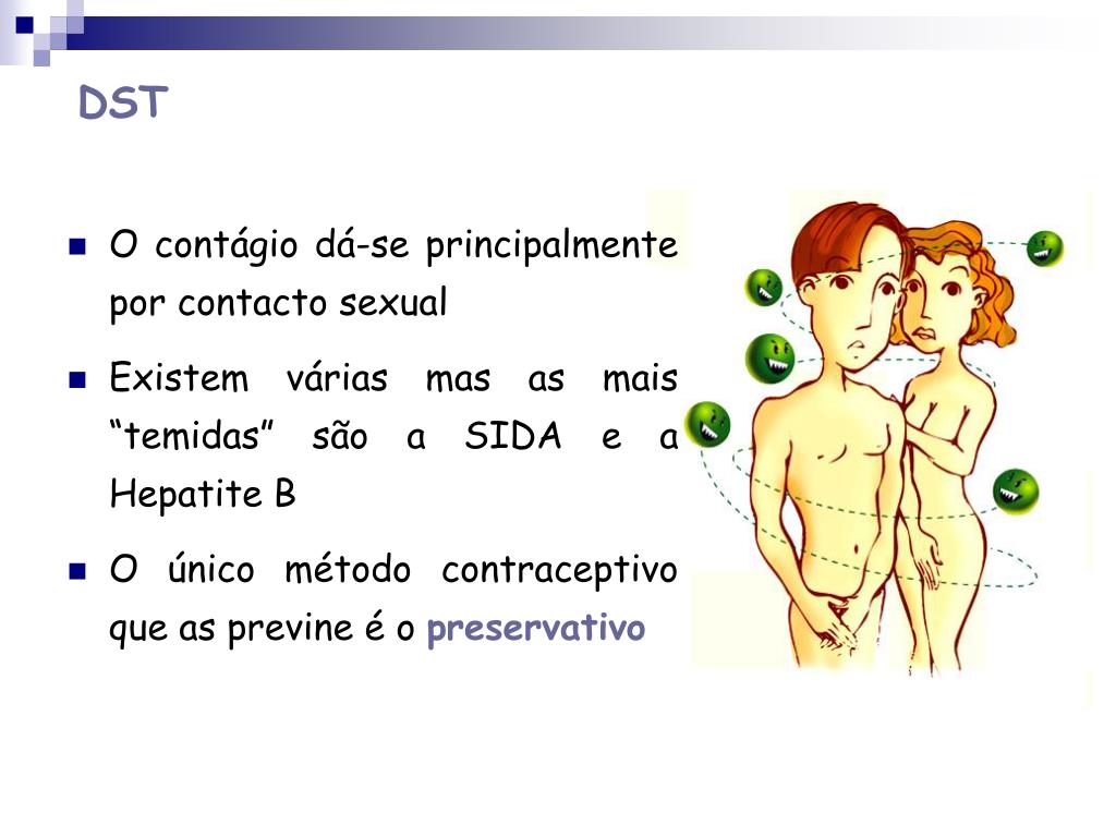 DST • O contágio dá-se principalmente por contacto sexual • Existem várias mas as mais “temidas” são a SIDA e a Hepatite B • O único método contraceptivo que as previne é o preservativo