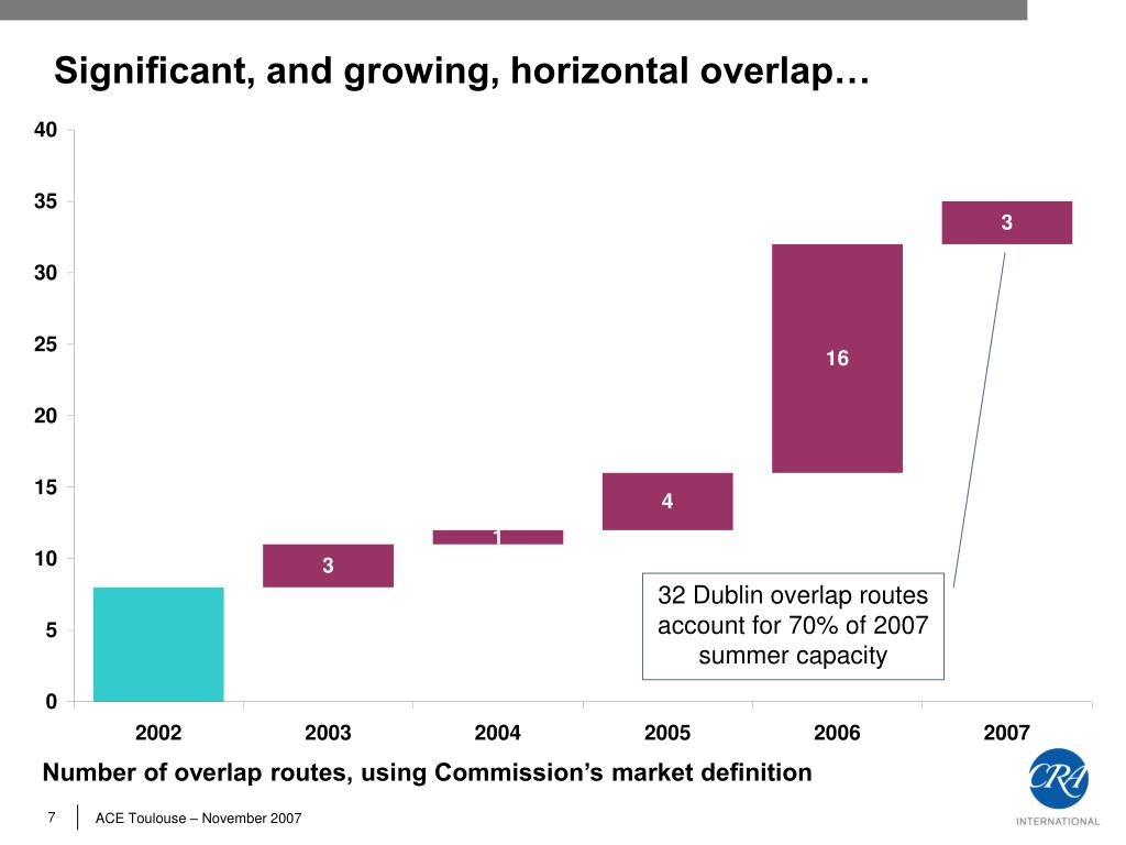 Significant, and growing, horizontal overlap… 32 Dublin overlap routes account for 70% of 2007 summer capacity Number of overlap routes, using Commission’s market definition ACE Toulouse – November 2007
