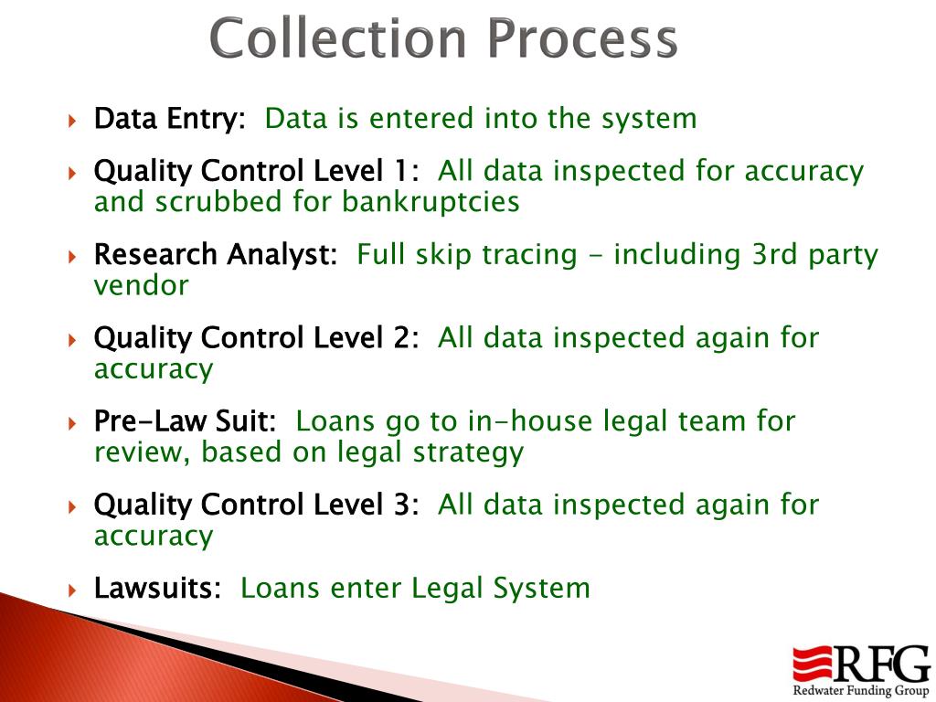 Collection Process Data Entry:Data is entered into the system Quality Control Level 1: All data inspected for accuracy and scrubbed for bankruptcies Research Analyst: Full skip tracing - including 3rd party vendor Quality Control Level 2:All data inspected again for accuracy Pre-Law Suit:Loans go to in-house legal team for review, based on legal strategy Quality Control Level 3:All data inspected again for accuracy Lawsuits: Loans enter Legal System