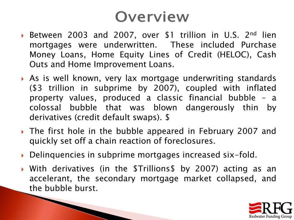 Between 2003 and 2007, over $1 trillion in U.S. 2nd lien mortgages were underwritten. These included Purchase Money Loans, Home Equity Lines of Credit (HELOC), Cash Outs and Home Improvement Loans. • As is well known, very lax mortgage underwriting standards ($3 trillion in subprime by 2007), coupled with inflated property values, produced a classic financial bubble – a colossal bubble that was blown dangerously thin by derivatives (credit default swaps). $ • The first hole in the bubble appeared in February 2007 and quickly set off a chain reaction of foreclosures. • Delinquencies in subprime mortgages increased six-fold. • With derivatives (in the $Trillions$ by 2007) acting as an accelerant, the secondary mortgage market collapsed, and the bubble burst.