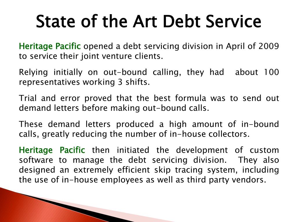 State of the Art Debt Service Heritage Pacific opened a debt servicing division in April of 2009 to service their joint venture clients. Relying initially on out-bound calling, they had about 100 representatives working 3 shifts. Trial and error proved that the best formula was to send out demand letters before making out-bound calls. These demand letters produced a high amount of in-bound calls, greatly reducing the number of in-house collectors. Heritage Pacifictheninitiated the development of custom software to manage the debt servicing division. Theyalso designed an extremely efficient skip tracing system, including the use of in-house employees as well as third party vendors.