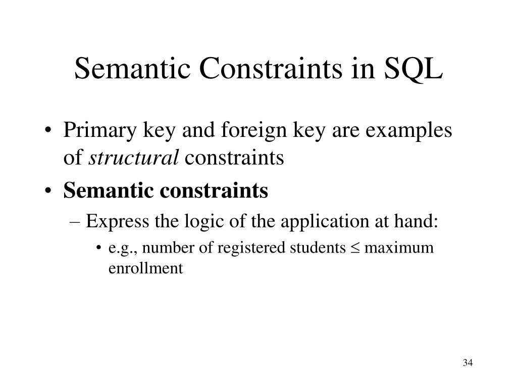 Semantic Constraints in SQL • Primary key and foreign key are examples of structural constraints • Semantic constraints • Express the logic of the application at hand: • e.g., number of registered students maximum enrollment