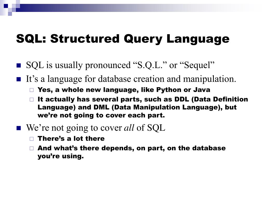 SQL: Structured Query Language • SQL is usually pronounced “S.Q.L.” or “Sequel” • It’s a language for database creation and manipulation. • Yes, a whole new language, like Python or Java • It actually has several parts, such as DDL (Data Definition Language) and DML (Data Manipulation Language), but we’re not going to cover each part. • We’re not going to cover all of SQL • There’s a lot there • And what’s there depends, on part, on the database you’re using.