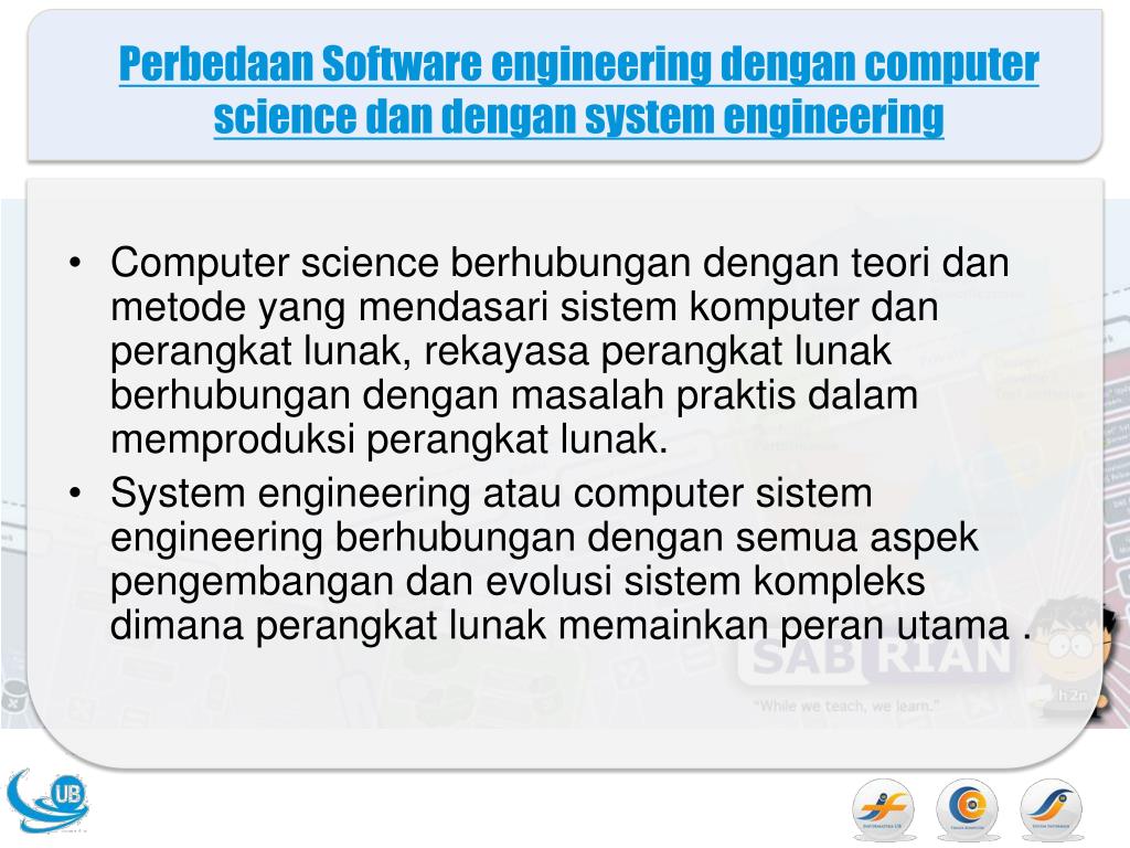 Perbedaan Software engineering dengan computer science dandengan system engineering • Computer science berhubungandenganteoridanmetode yang mendasarisistemkomputerdanperangkatlunak, rekayasaperangkatlunakberhubungandenganmasalahpraktisdalammemproduksiperangkatlunak. • System engineering atau computer sistem engineering berhubungandengansemuaaspekpengembangandanevolusisistemkompleksdimanaperangkatlunakmemainkanperanutama .