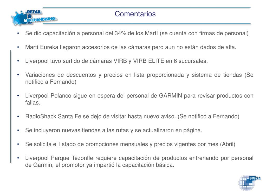 Comentarios • Se dio capacitación a personal del 34% de los Martí (se cuenta con firmas de personal) • Martí Eureka llegaron accesorios de las cámaras pero aun no están dados de alta. • Liverpool tuvo surtido de cámaras VIRB y VIRB ELITE en 6 sucursales. • Variaciones de descuentos y precios en lista proporcionada y sistema de tiendas (Se notifico a Fernando) • Liverpool Polanco sigue en espera del personal de GARMIN para revisar productos con fallas. • RadioShackSanta Fe se dejo de visitar hasta nuevo aviso. (Se notificó a Fernando) • Se incluyeron nuevas tiendas a las rutas y se actualizaron en página. • Se solicita el listado de promociones mensuales y precios vigentes por mes (Abril) • Liverpool Parque Tezontle requiere capacitación de productos entrenando por personal de Garmin, el promotor ya impartió la capacitación básica.