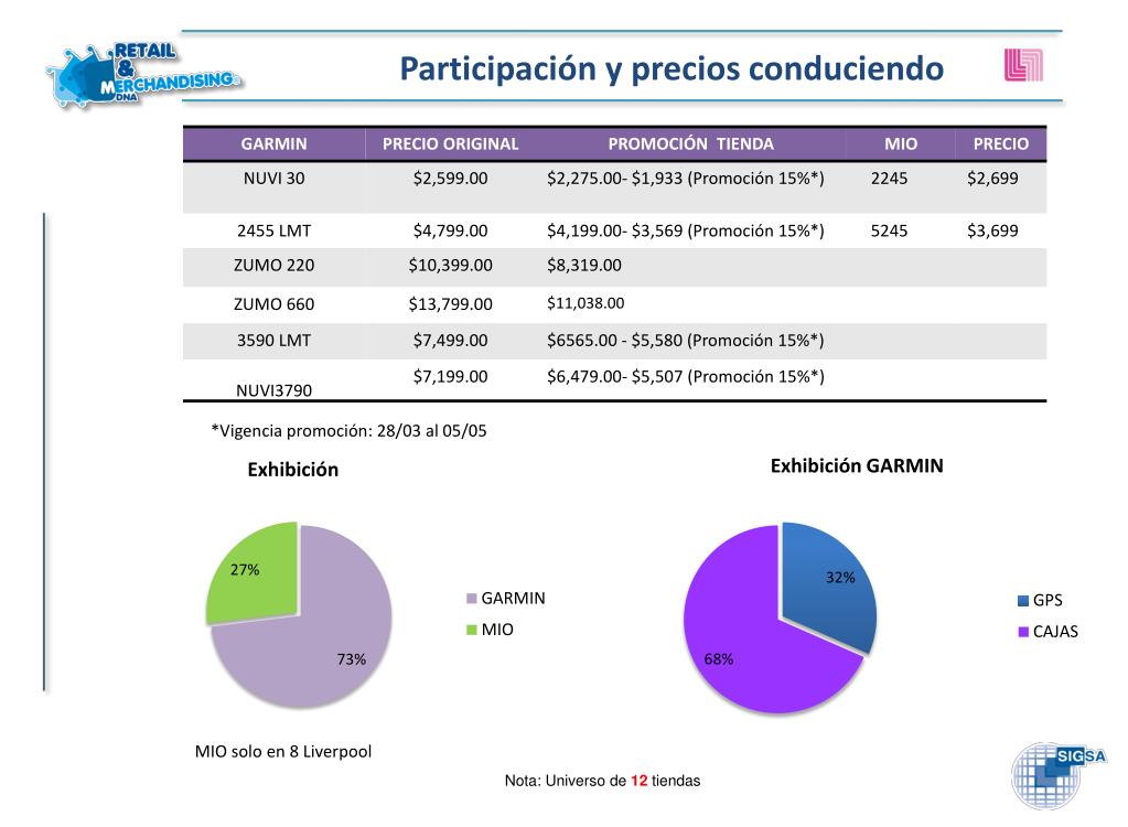 Reporte Ejecutivo Marzo 2014. Participación y precios conduciendo. *Vigencia promoción: 28/03 al 05/05. MIO solo en 8 Liverpool. Nota: Universo de 12 tiendas . Participación Entrenando. En Lindavista y Ecatepec no hay producto en esta categoría. Tienda de nuevo ingreso Tezontle.