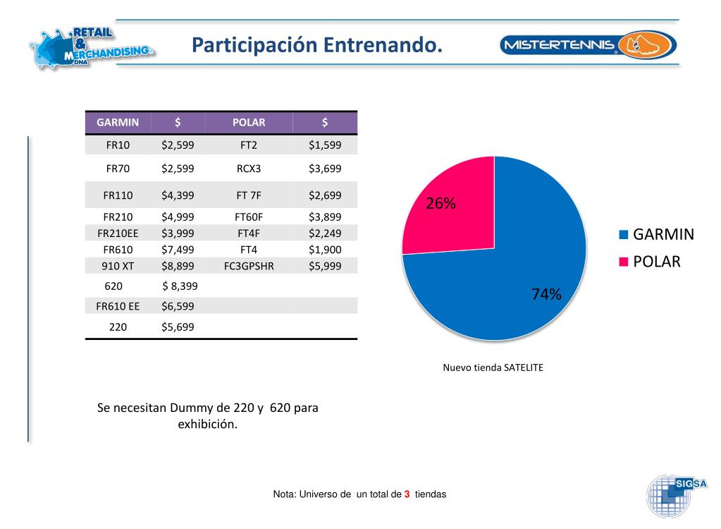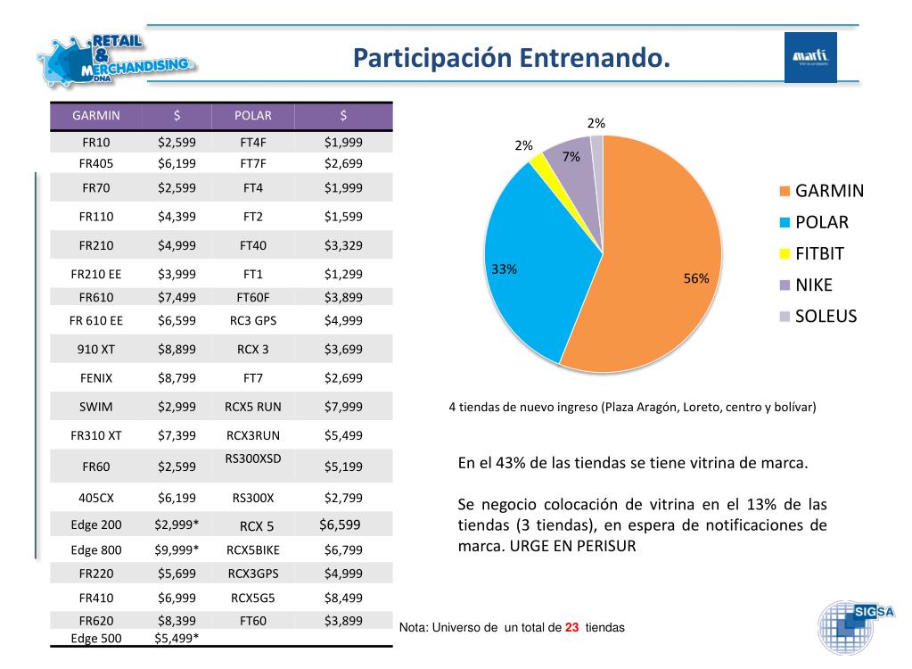 Next Steps. • Actualización de lista de precios y descuentos • Elaboración de fichas técnicas provisionales para nuevos modelos. • Se seguirá impartiendo capacitación a personal de tienda hasta tener el 100% de cobertura con evidencias. (Nombre y firma) • Negociación de introducción de vitrinas o cambios de lugar de las mismas en las tiendas. • Se sugiere implementar sábados de venta en tiendas con inventarios no resurtibles(Se requiere definir meta de ventas para generar las bases del programa) • Se sugiere generar medidores de performance de ventas vs exhibición (Se requiere información de ventas por parte de Garmin)