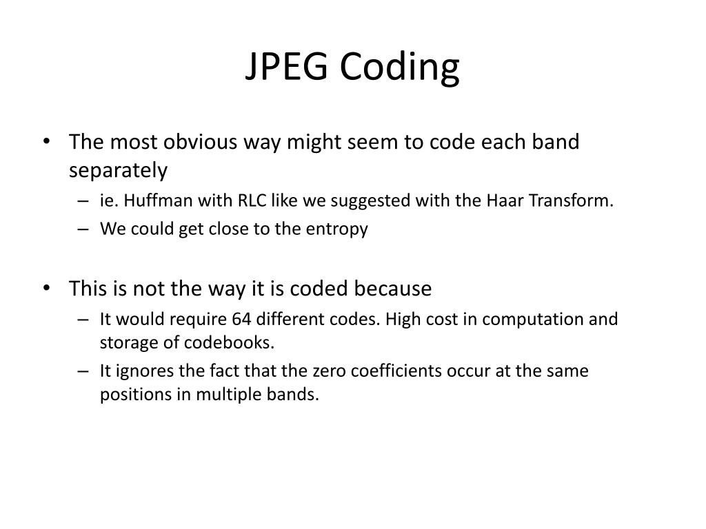 JPEG Coding • The most obvious way might seem to code each band separately • ie. Huffman with RLC like we suggested with the Haar Transform. • We could get close to the entropy • This is not the way it is coded because • It would require 64 different codes. High cost in computation and storage of codebooks. • It ignores the fact that the zero coefficients occur at the same positions in multiple bands.